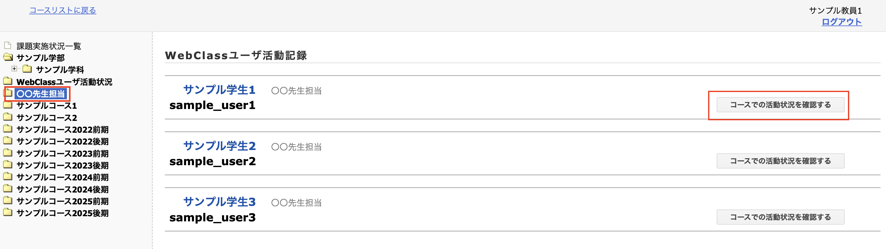 2. 先程作成した組織が表示されるので、開きます。その後、出席状況を確認したい学生の「コースでの活動状況を確認する」をクリックします。