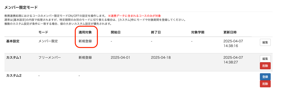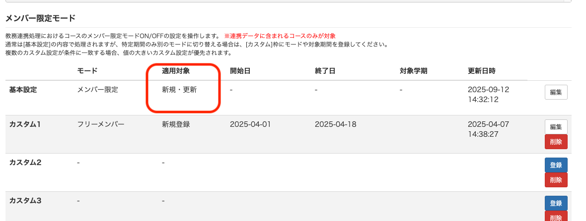教務連携設定の「メンバー限定モード」で、基本設定の「適用対象」が「新規」となっているためです。