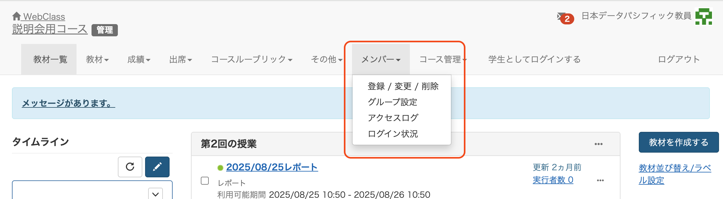 Q:コースに教員や学生を追加するには? 回答: コースメンバーの追加は、システム管理者・教員・TA が実施できます。 教員、学生を追加したいコースへアクセスします。 メニュー一覧の「メンバー」から「登録/変更/削除」と進みます。 「メンバーを追加」から検索条件で該当の教員または学生を検索します。 ※「*」を利用して部分一致検索も可能です。 検索結果から該当ユーザーにチェックを入れ、「付与するコース権限」を選択します。 ※教員・学生以外にも「TA」「SA」の権限が付与できます。 ...